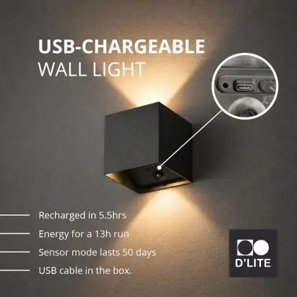 Mit der D'Lite LED-Wandleuchte aus der Elingen-Serie erhalten Sie ein hochwertiges Produkt zu einem günstigen Preis, das sowohl für den Innen- als auch den Aussenbereich geeignet ist. Die Leuchte verfügt über einen eingebauten Sensor und wird batteriebetrieben, was sie besonders flexibel macht. Die Installation ist denkbar einfach: Sie befestigen lediglich eine magnetische Platte an Ihrer Fassade. Zum Aufladen der Batterie lässt sich die Leuchte ganz unkompliziert von der Platte abnehmen.