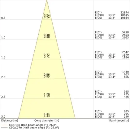 Der Abstrahlwinkel bezeichnet den Winkel, in dem das Licht aus der Lichtquelle ausgestrahlt wird. Er wird in Grad (D) angegeben. Je geringer die Gradzahl des Abstrahlwinkels ist, desto kleiner ist auch der Durchmesser des Lichtkegels, den die Lichtquelle produziert. Beispiel: Wird eine Lampe mit einem Abstrahlwinkel von 60 Grad an der Decke (2,5 m Höhe) angebracht, erzeugt sie einen Lichtkegel von 2,9 Metern Durchmesser. Hat die Lampe hingegen einen Abstrahlwinkel von 120 Grad, beträgt der Lichtkegel 8,7 Meter im Durchmesser. |